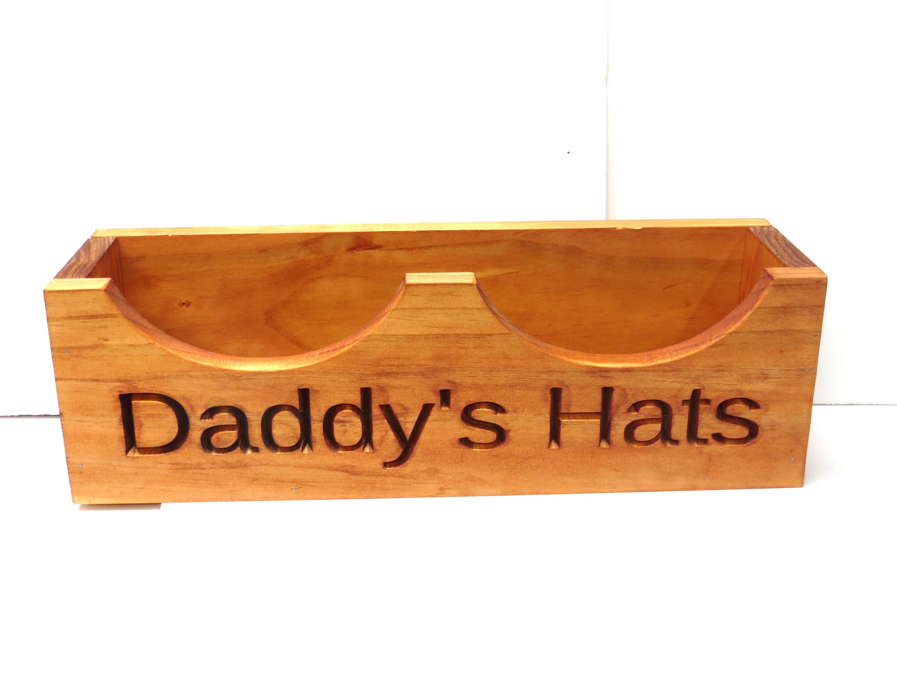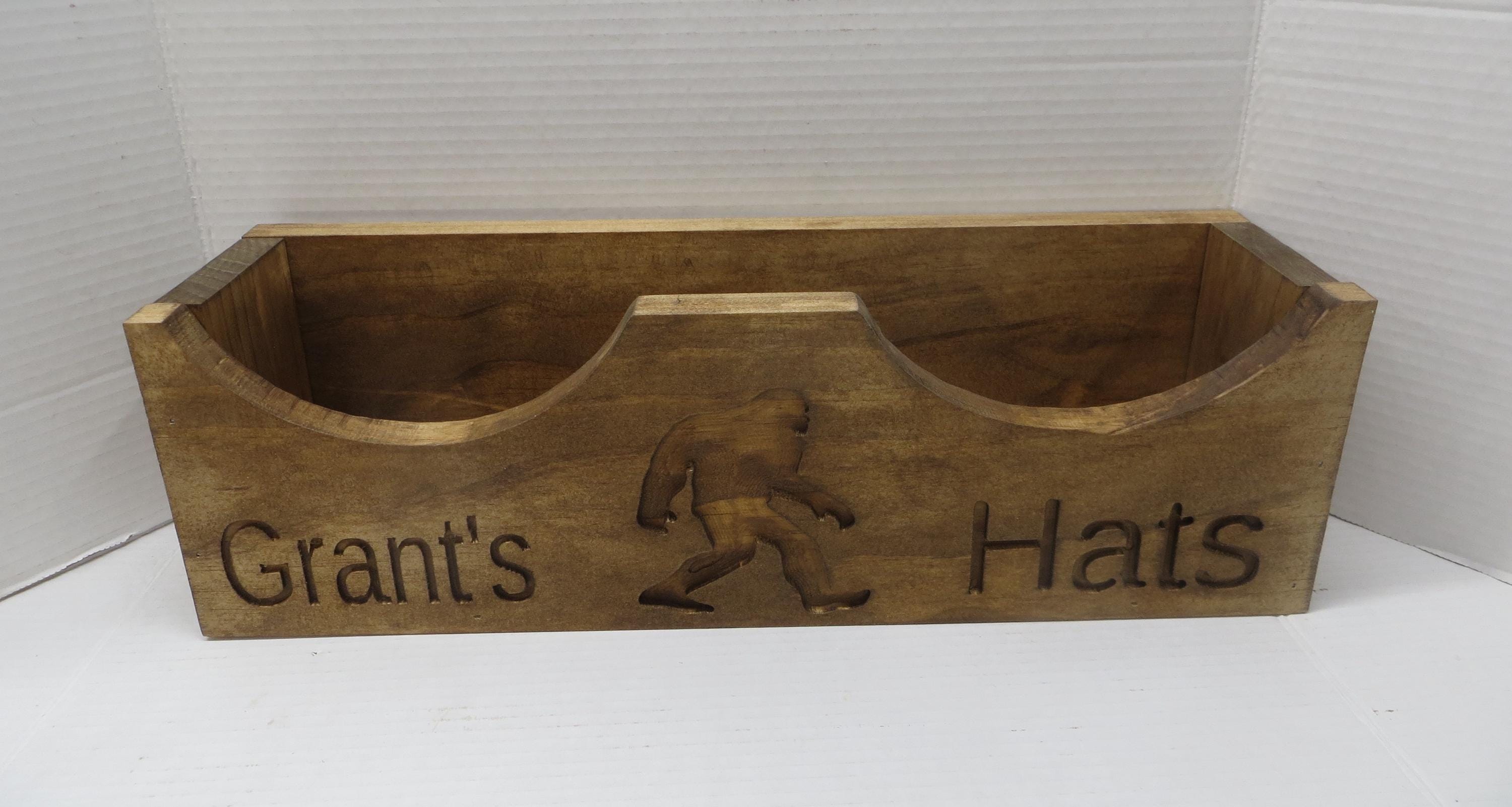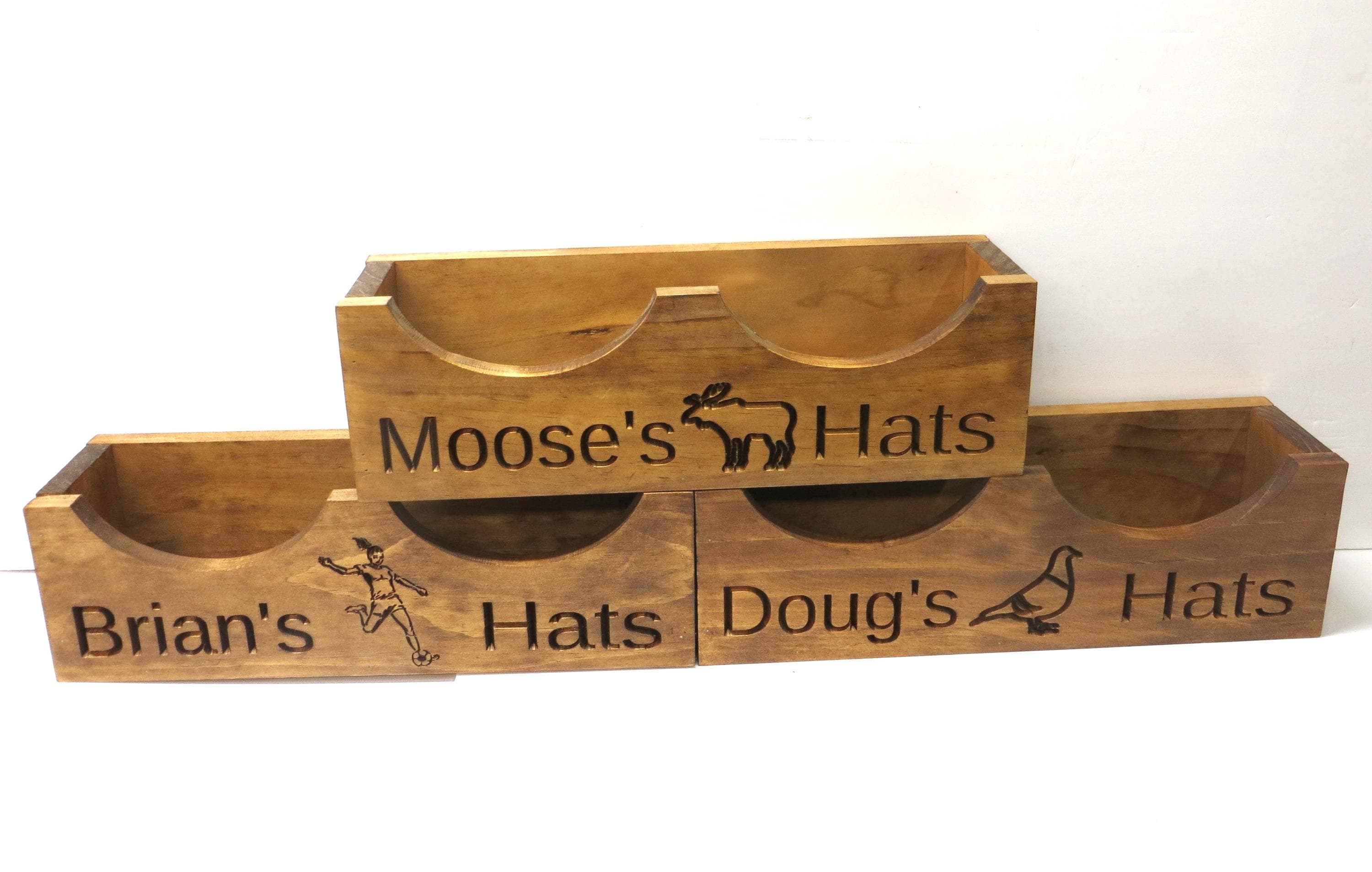 Wooden hat organizer for all your baseball caps. You can put 6 to 8 hats on each side. Not made from plywood made from select pine boards that are 3/4" thick, not made from thin plywood. Very well-made double cap holder 18" long by 5 " wide and 5 1/2" tall. We can possible add whatever saying or item that you would like on the board and put it under the CNC machine no paint or decal. Then the boards are sanded and stained or painted whatever way we or our customer would like. Wood is a natural product, variations in wood grain may occur slightly altering the finished product's final look from one piece to another.