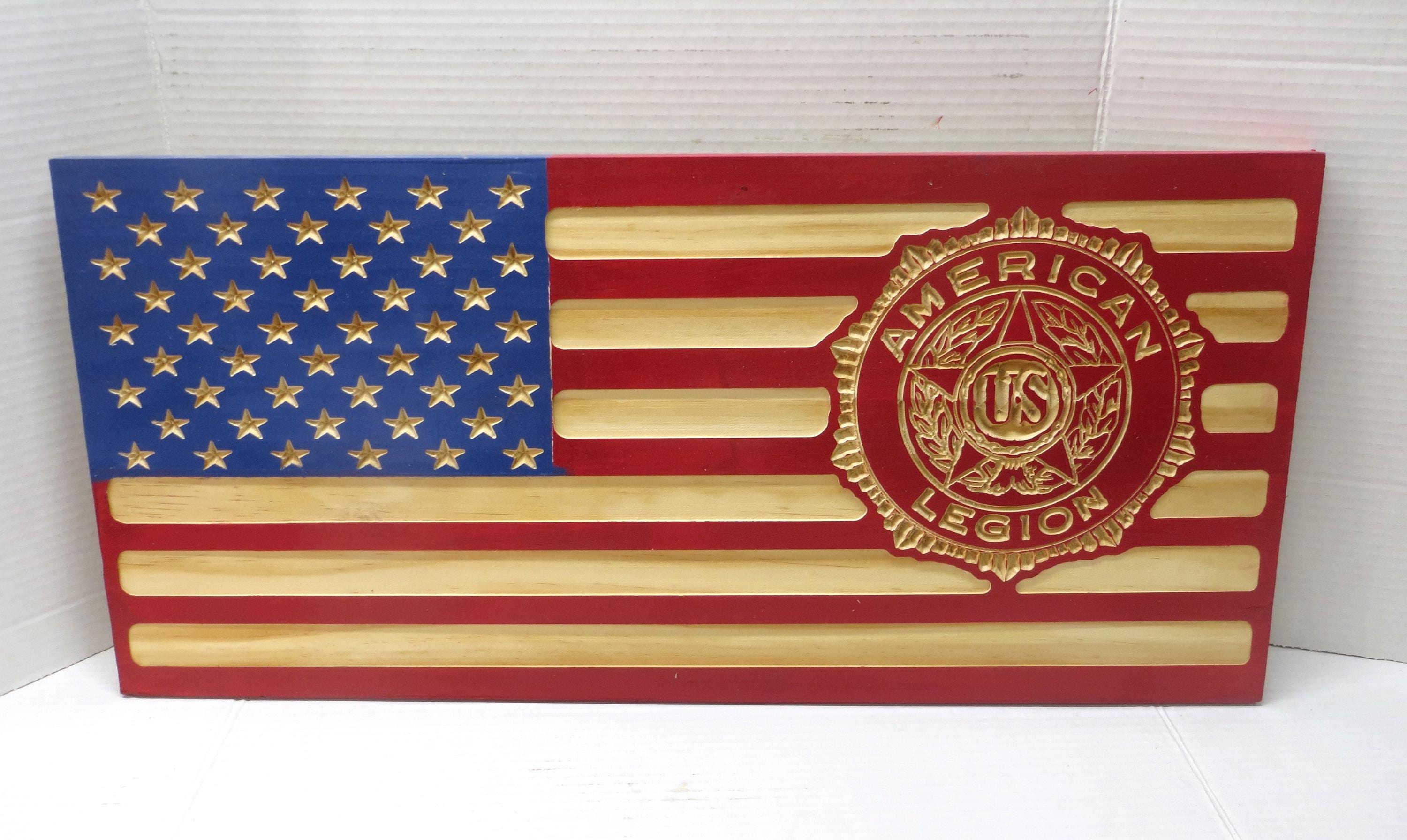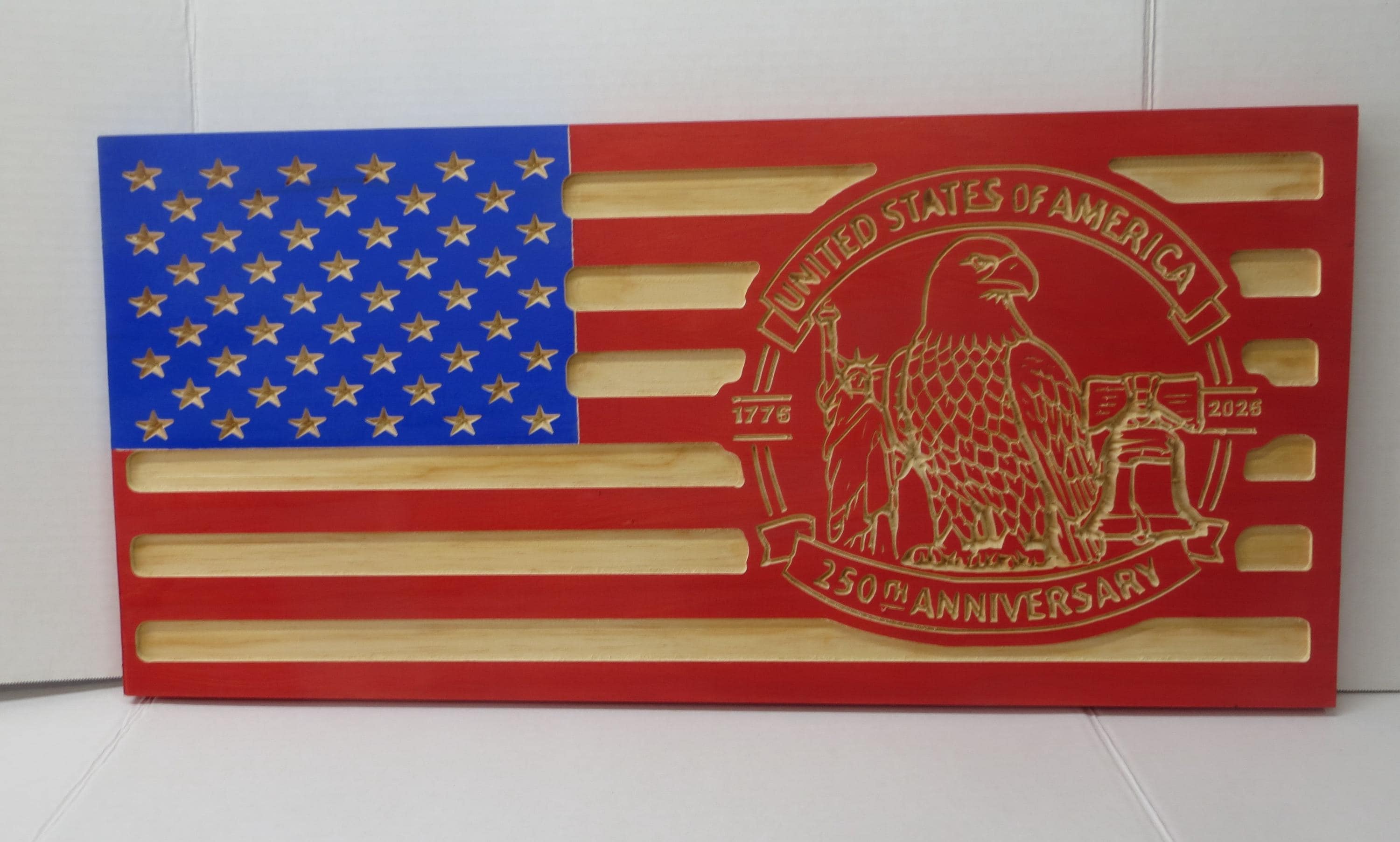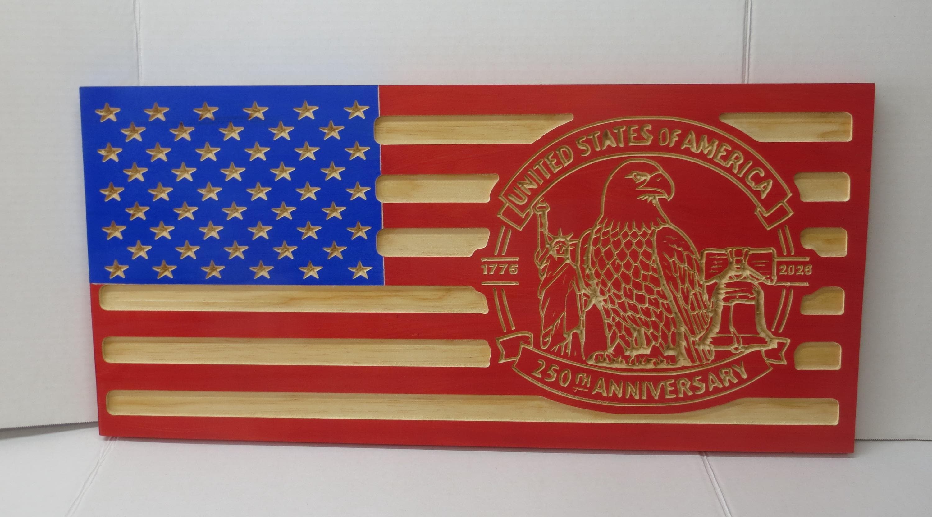 We first send a picture from the computer of what the flag would look like before we cut it out on the CNC machine. It is cut into wood not burnt by a laser or decaled. Then after it is done, we paint a blue line on it if needed and then spray it with a high gloss glaze and send another picture to make sure customer approves of final product.